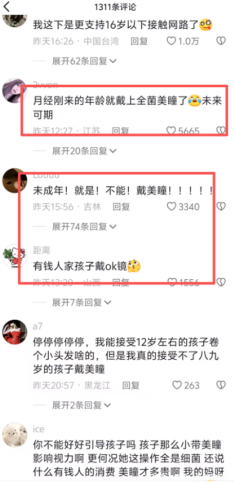 而这个美瞳简直就是全菌美瞳,戴上去之后不知道八九岁的孩子的眼睛和身体会受到多大的影响,家长还不懂呢,这也不能全怪家长。